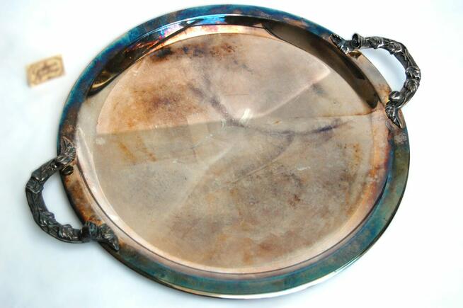 Piękna, rzadko spotykana taca platerowana srebrem ze wzorem róży na uchwytach - Resovia, z okresu PRL. Okrągła taca jest ...